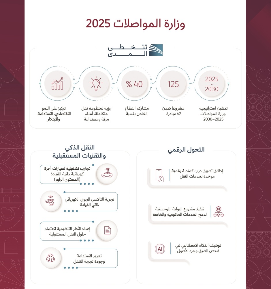 أصدرت وزارة المواصلات، امس، بياناً بشأن أبرز محطات عام 2025، إذ تم تنفيذ 125 مشروعًا موزعاً على 42 مبادرة، تزامناً مع رفع مشاركة القطاع الخاص إلى 40%. وذكرت وفق بيان أن عام 2025 تضمن رؤية الوزارة لمنظومة نقل متكاملة آمنة ومرنة ومستدامة، والتركيز على النمو الاقتصادي المستدام والتنافسية. وعلى صعيد التحول الرقمي، اتجهت الوزارة إلى إطلاق نسخة موحّدة من تطبيق «درب» لخدمات النقل، إلى جانب تنفيذ مشروع البوابة اللوجيستية لدمج منصات الخدمات الحكومية والخاصة، وتوظيف الذكاء الاصطناعي في فحص الطرق وجرد الأصول. وبشأن النقل الذكي والتقنيات المستقبلية، تضمنت خطة 2025 تجارب تشغيلية للسيارات الأجرة الذاتية المستوى الرابع، وتجربة التاكسي الجوي الكهربائي ذاتي القيادة، مع إعداد أطر تنظيمية لاعتماد حلول النقل المستقبلية، وتعزيز الاستدامة وجودة تجربة النقل.