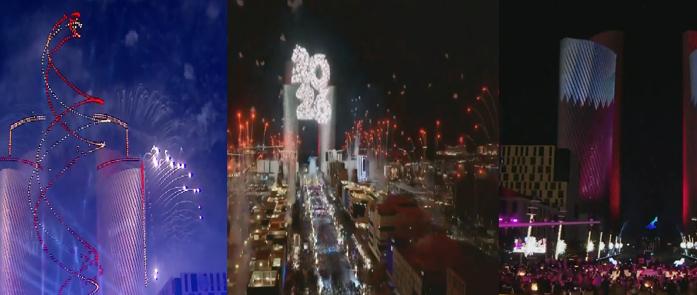 وعند اللحظة المنتظرة مع حلول منتصف الليل، تحولت سماء لوسيل إلى لوحة فنية ساحرة، عبر عرض ضخم للألعاب النارية تزامن مع عرض استثنائي لطائرات الدرون، عبر ٤٠٠٠ طلقة العاب نارية من ١٠٠٠ طائرة “بايرودرون” من ٤٦ موقعاً مختلفاً. وبإجمالي ١٥الفا و٣٠٠ طلقة العاب نارية مفردة ليقدما معًا مشهدًا بصريًا لافتًا نال إعجاب الحضور. وتشكلت في السماء تصاميم ضوئية مبتكرة عكست روح المستقبل وطموح المدينة في أن تكون مركزًا للفن والإبداع.