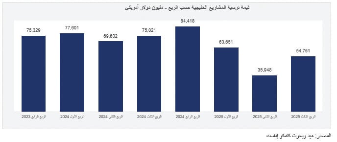 وسجلت القيمة الإجمالية للمشاريع المسندة في المنطقة انخفاضاً بنسبة 27%سنوياً في الربع الثالث من العام إلى 54.8 مليار دولار؛ مما يعتبر ثاني أدنى مستوياتها على مدار العشر فترات ربع السنوية الأخيرة، مقابل 75 مليار دولار في الربع ذاته عام 2024.