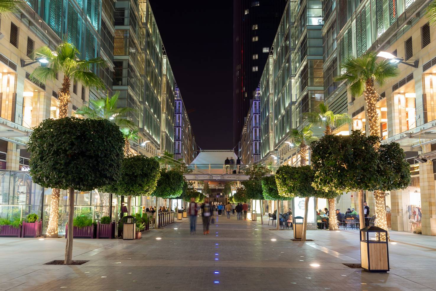 فهناك تجد مجمعاً تجارياً ضخماً وأماكن عديدة لتناول الطعام الشرقي والغربي، كما توجد مساحة جميلة مخصصة للمشاة تنتشر على جانبيها المقاهي وتتوسطها نافورة مياه يصطف حولها الناس جالسين على السلالم المحيطة بها، وهم يتناولون كوباً من العصير وقطعة من الحلوى.