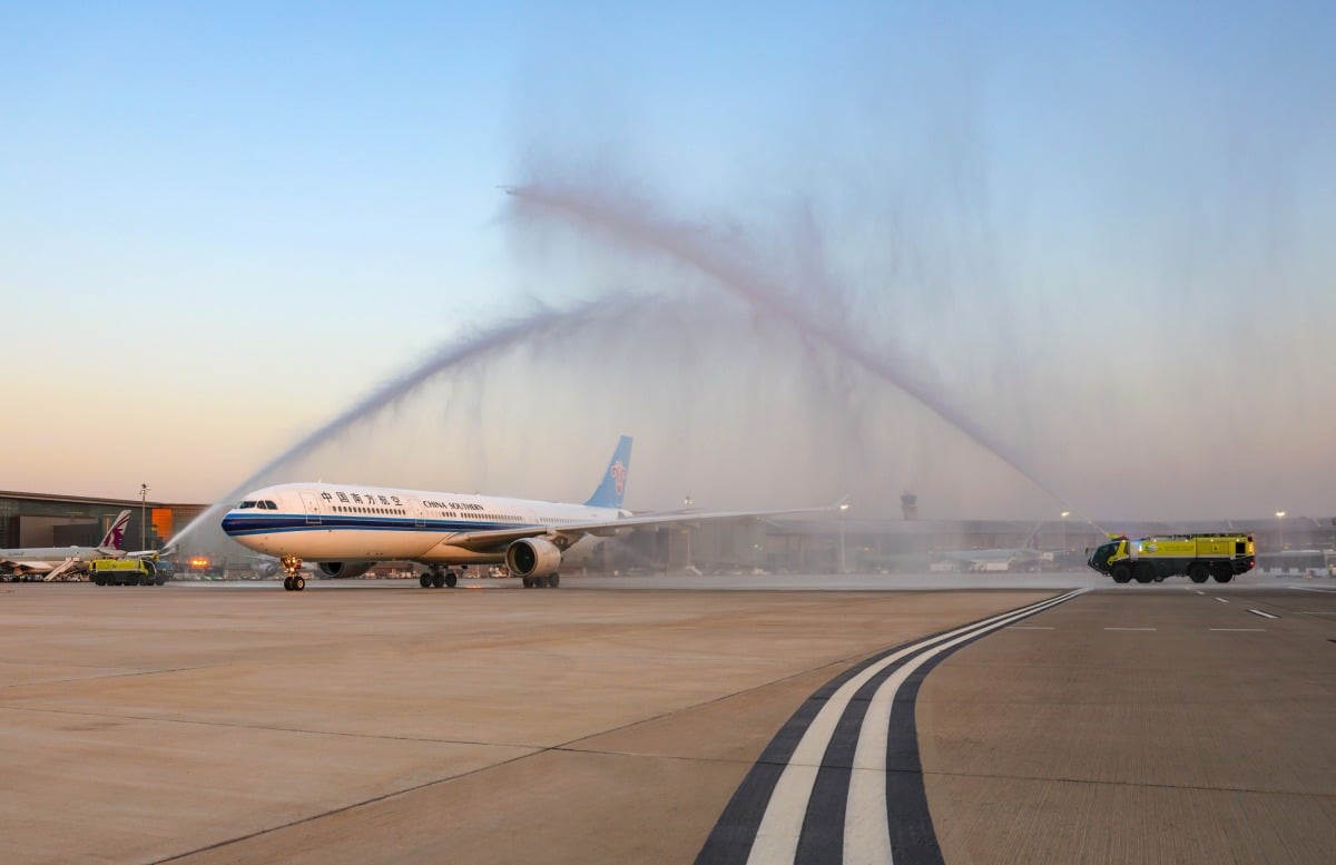 احتفل مطار حمد الدولي، بوصول أولى الرحلات الجوية المباشرة لطيران خطوط جنوب الصين الجوية، القادمة من مطار بكين داشينغ الدولي، إيذانا بتدشين خط جوي جديد يربط بين العاصمة الصينية بكين والدوحة.
