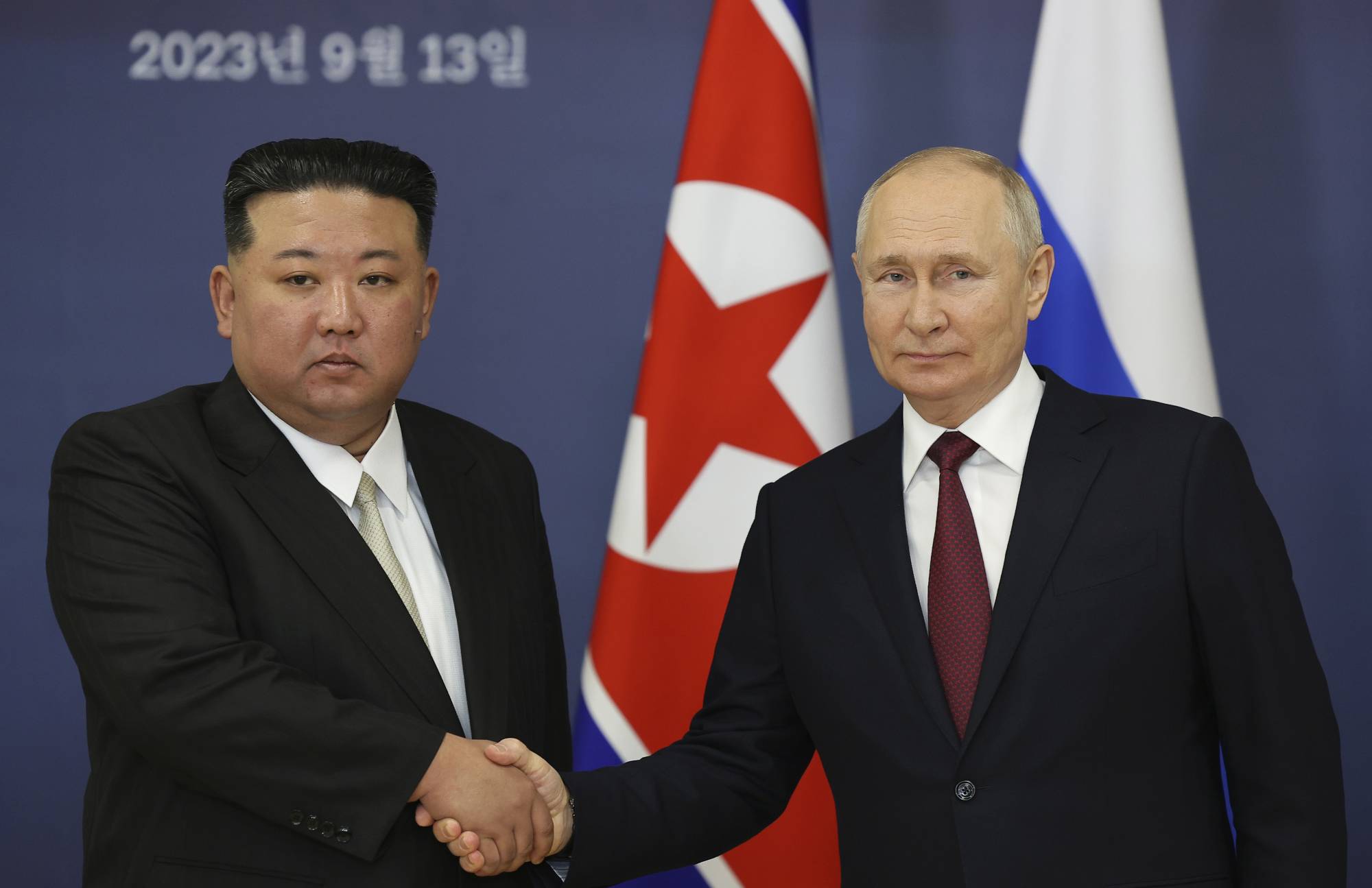 الرئيس الروسي فلاديمير بوتين يصافح الزعيم الكوري كيم جون أون (أرشيفية – أ.ب)