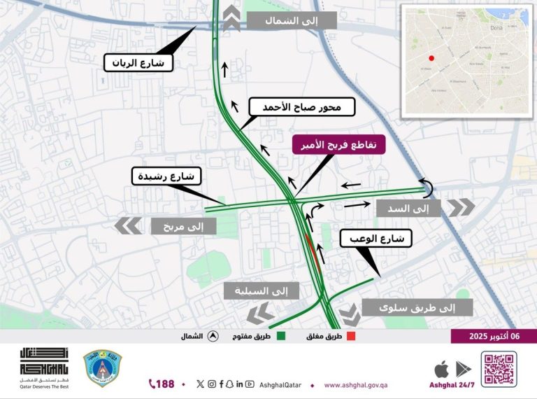 أعلنت هيئة الأشغال العامة أشغال عن تنفيذ إغلاق مروري مؤقت على محور صباح الأحمد، حيث سيتم إغلاق المخرج الرابط لحركة السير القادمة من جسر تقاطع الوعب في الاتجاه المؤدي إلى نفق وطريق الريان، وذلك يوم الخميس 9 أكتوبر 2025، من الساعة 1:00 صباحًا حتى 5:00 صباحًا، وذلك بهدف تنفيذ أعمال صيانة لأعمدة الإنارة، بالتنسيق مع الإدارة العامة للمرور.