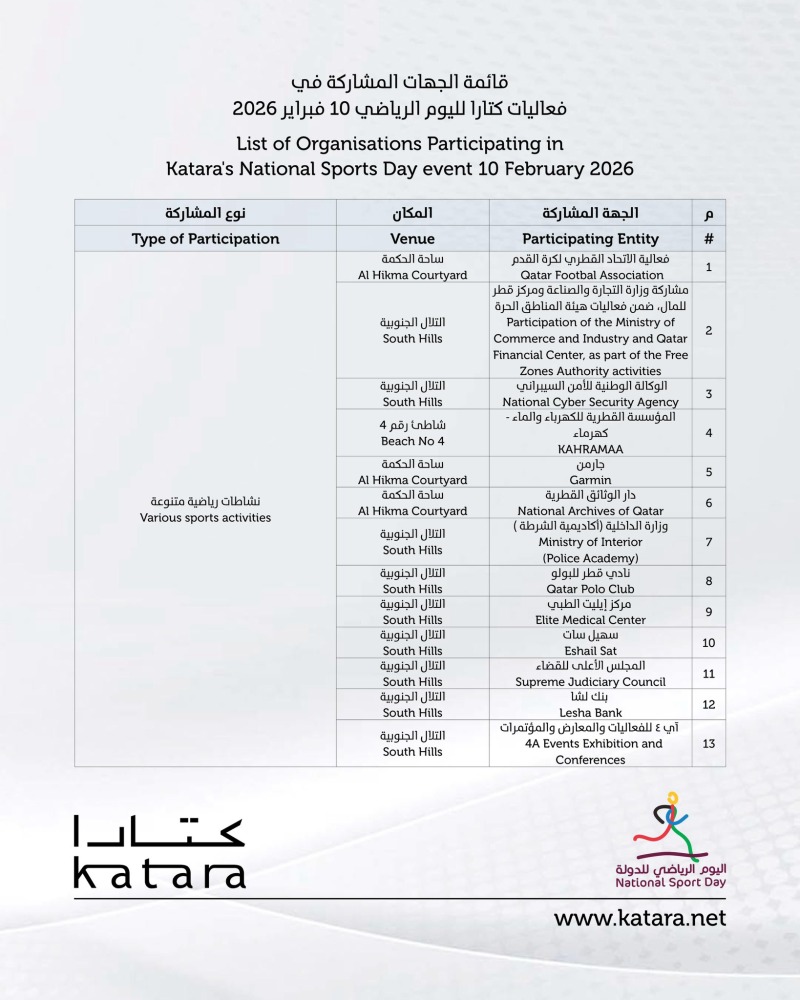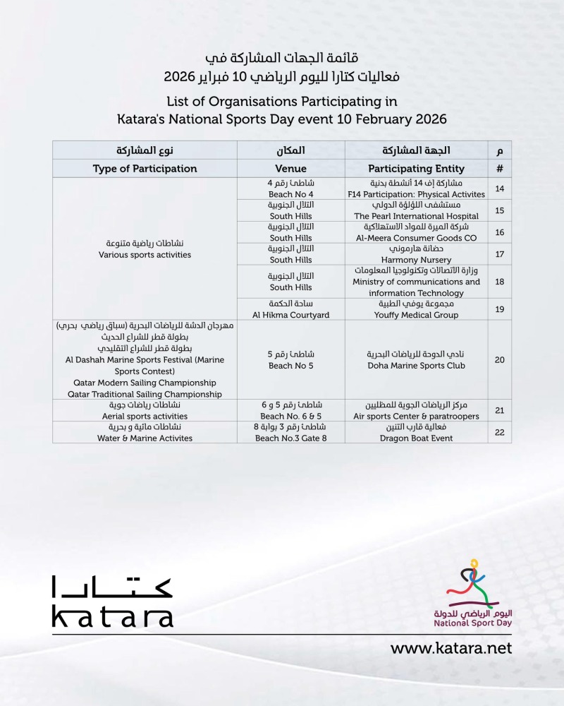 تتحول دولة قطر في اليوم الرياضي للدولة إلى ملعب كبير لممارسة الأنشطة الرياضية، حيث تنظم جميع الجهات والمؤسسات عدداً من الفعاليات لمنتسبيها .