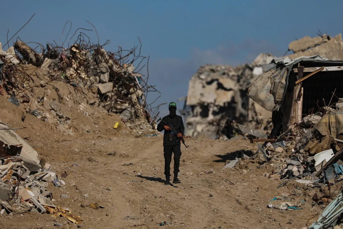 مقاتلو «كتائب القسام» إلى جانب عمال «الصليب الأحمر» خلال البحث عن جثث رهائن إسرائيليين في مدينة غزة… نوفمبر الماضي (إ.ب.أ)