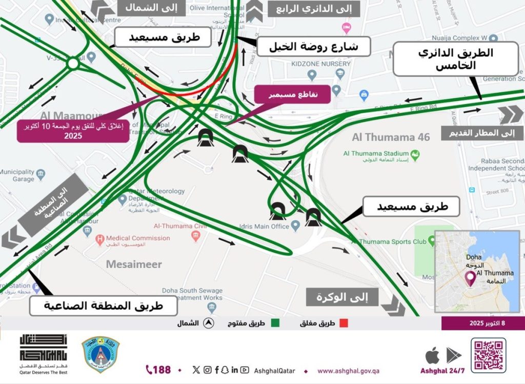 أعلنت هيئة الأشغال العامة "أشغال" عن إغلاق نفق تقاطع مسيمير أمام القادمين من طريق مسيعيد باتجاه شارع روضة الخيل، وذلك يوم الجمعة 10 أكتوبر 2025، من الساعة 2:00 صباحًا حتى 10:00 صباحًا، بهدف تنفيذ أعمال صيانة ضرورية.