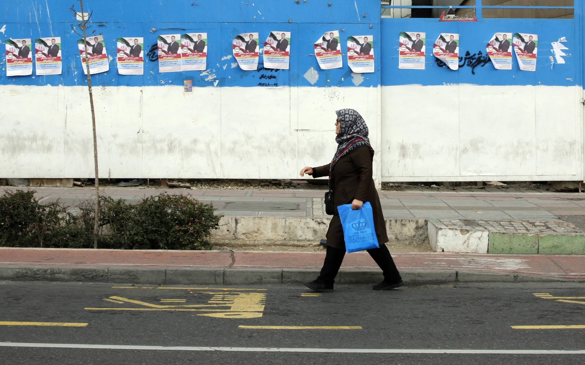 إيرانية تمشي بجانب ملصقات خلال اليوم الأول من الحملات الانتخابية البرلمانية في طهران (إ.ب.أ)