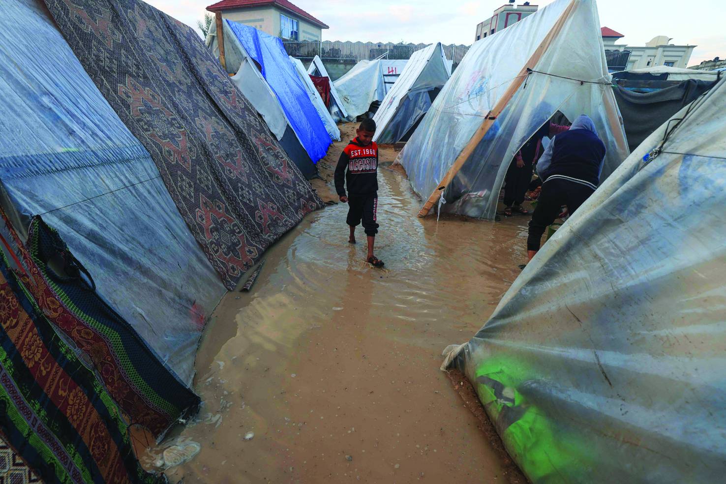 صبي فلسطيني نازح يسير وسط خيام غمرتها الأمطار الغزيرة في رفح جنوب قطاع غزة (أ.ف.ب)
