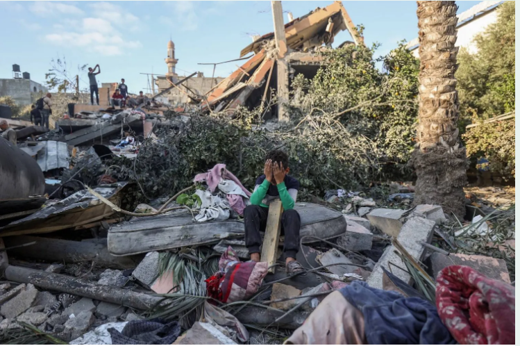 طفل يجلس وسط أنقاض منزل دمره القصف الإسرائيلي في النصيرات وسط قطاع غزة (أ.ف.ب)