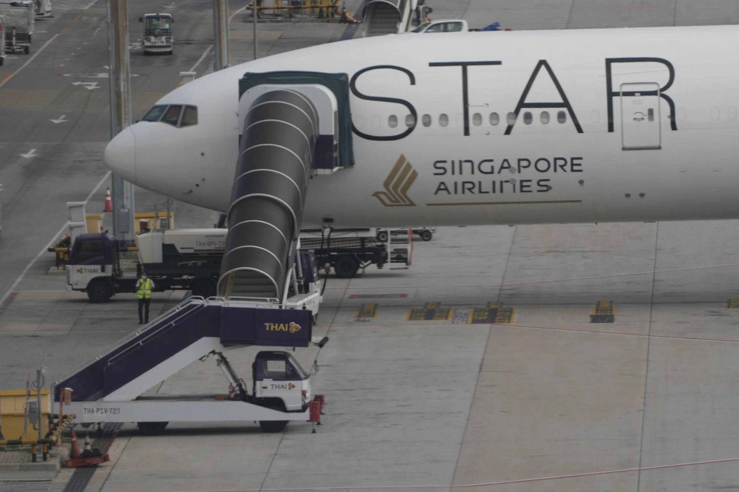 الطائرة السنغافورية بعد تعرضها لمطبات هوائية شديدة وهبوطها الاضطراري (رويترز)