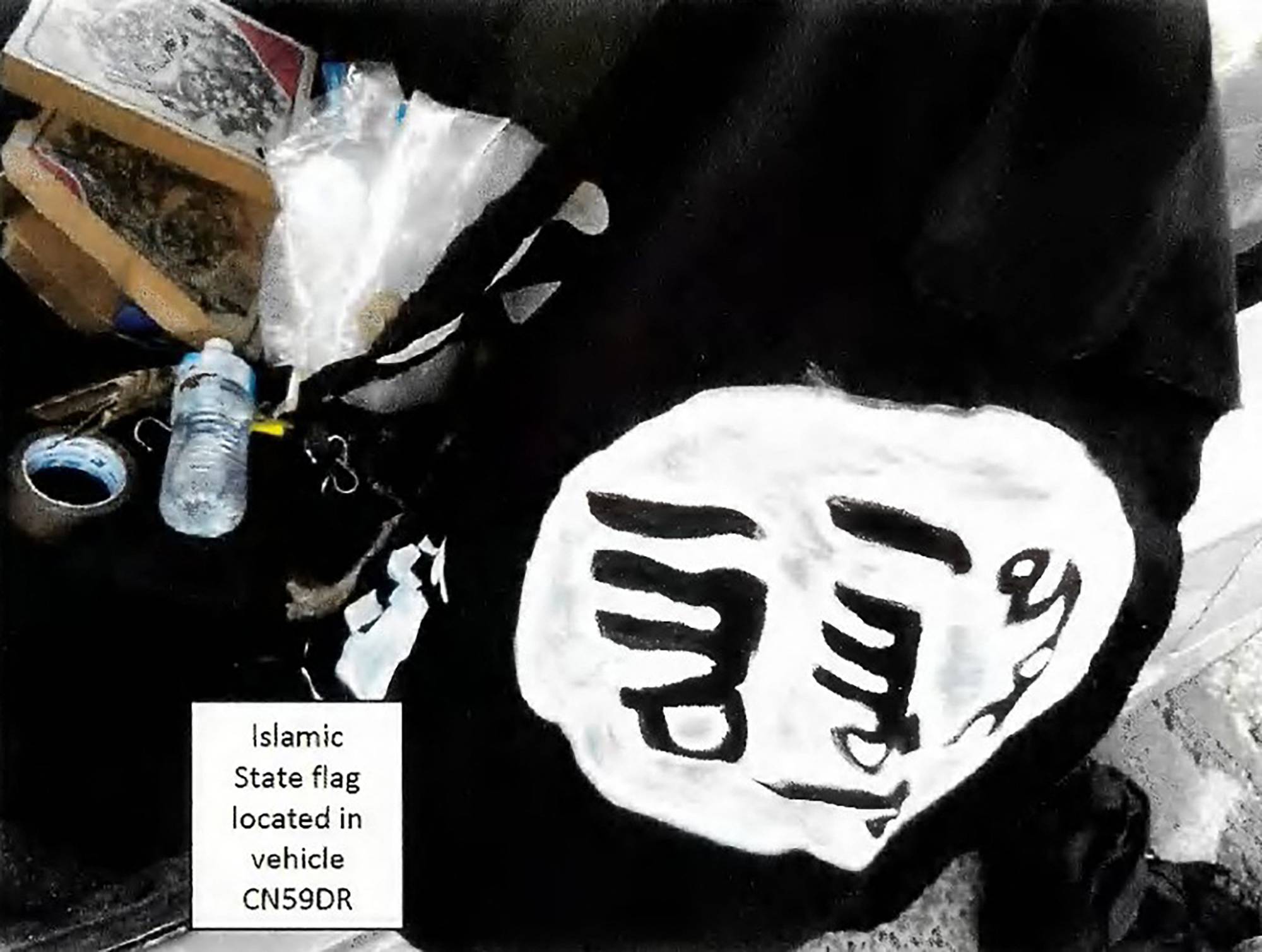 تُظهر هذه الصورة منظراً عاماً لعلمٍ محلي الصنع لتنظيم «داعش» وُجد داخل السيارة المسجلة باسم نافيد أكرم في سيدني (أ.ف.ب)