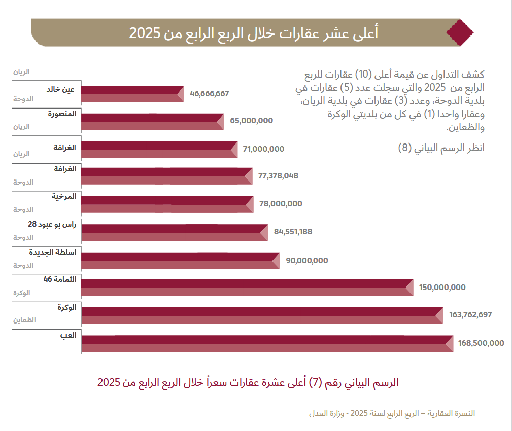 كشف التداول بحسب النشرة العقارية التحليلية للربع الرابع من 2025 التي نشرتها وزارة العدل عبر منصة “إكس”، اليوم السبت، عن قيمة أعلى 10 عقارات في الربع الرابع من عام 2025 والتي سجلت عدد 5 عقارات في بلدية الدوحة وعدد 3 عقارات في بلدية الريان وعقاراً واحداً في كل من بلديتي الوكرة والظعاين.