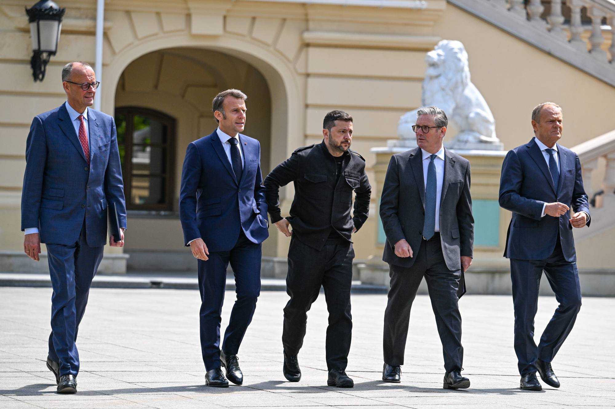 الرئيسان الفرنسي ماكرون والأوكراني زيلينسكي ورئيس الوزراء البريطاني ستارمر ونظيره البولندي تاسك والمستشار الألماني ميرتس في كييف يوم 10 مايو (إ.ب.أ)