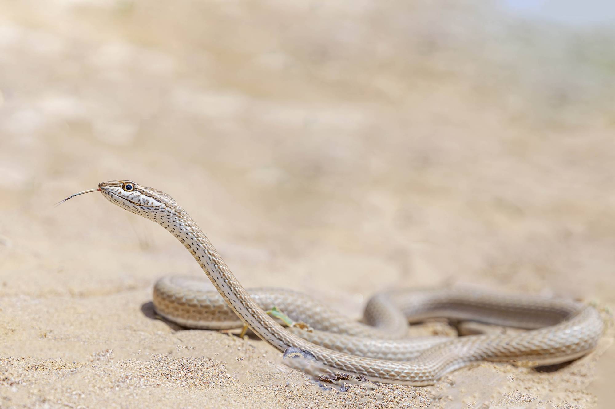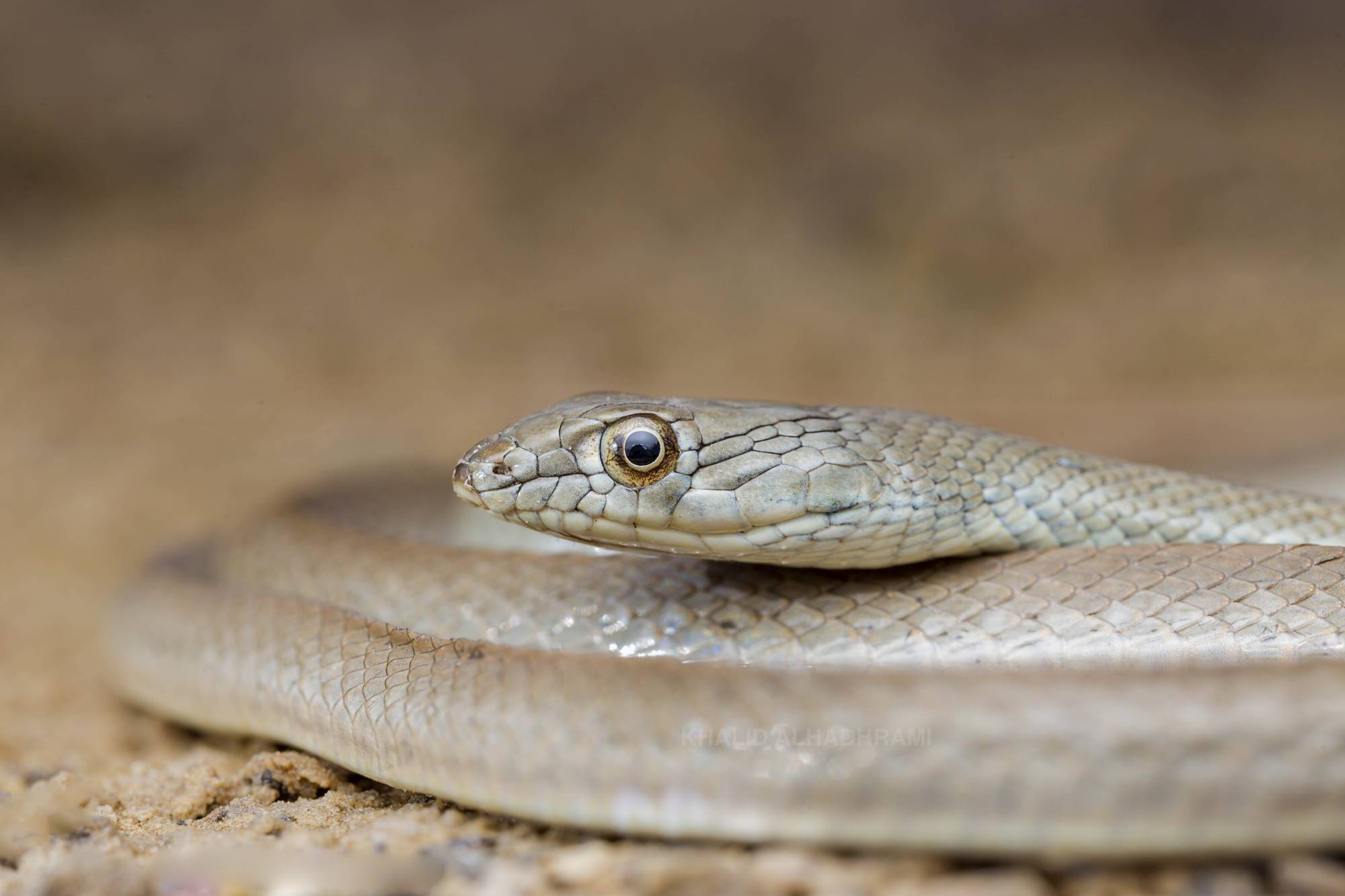وللبيداء نصيبها من الأفاعي أيضا… ومن بينها «ثعبان الرمال الأفرو-آسيوي» المنتشر في أغلب مناطق شبه الجزيرة العربية. تعد هذه الأفعى ضعيفة السمية، إذ لا تتسبب عضتها للبشر إلا بحساسية بسيطة، وهي تتغذى على الحشرات بشكل رئيسي. (تصوير: خالد الحضرمي)