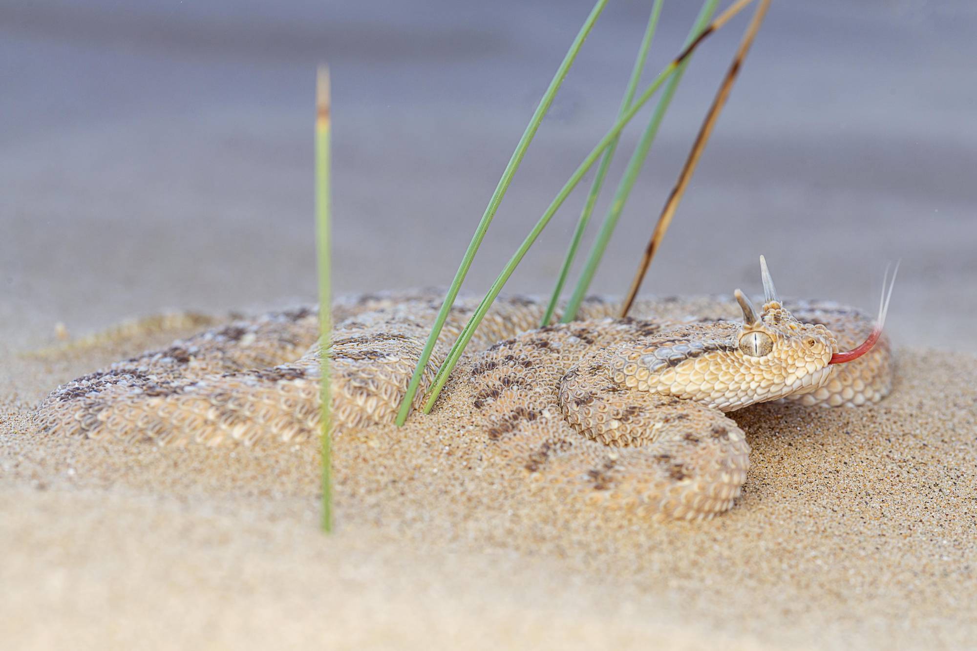 تمتاز «أفعى الرمال العربية المقرنة» بجسم غليظ ورأس مثلث وبوجود قرنين واضحين على رأسها، ويلقبها الأهالي كذلك بـ«أم جنيب» بسبب حركة زحفها الجانبية. تمتلك هذه الأفعى القدرة على دفن نفسها داخل الرمال لفترات طويلة في انتظار مرور فرائسها من الفئران والسحالي والطيور الصغيرة؛ وهي ذات سمية شديدة، إذ يفتك سمها بالجهاز العصبي ويحطم خلايا الدم. هذه الأفعى مسؤولة عن معظم حالات العض في المملكة العربية السعودية. (تصوير: خالد الحضرمي)