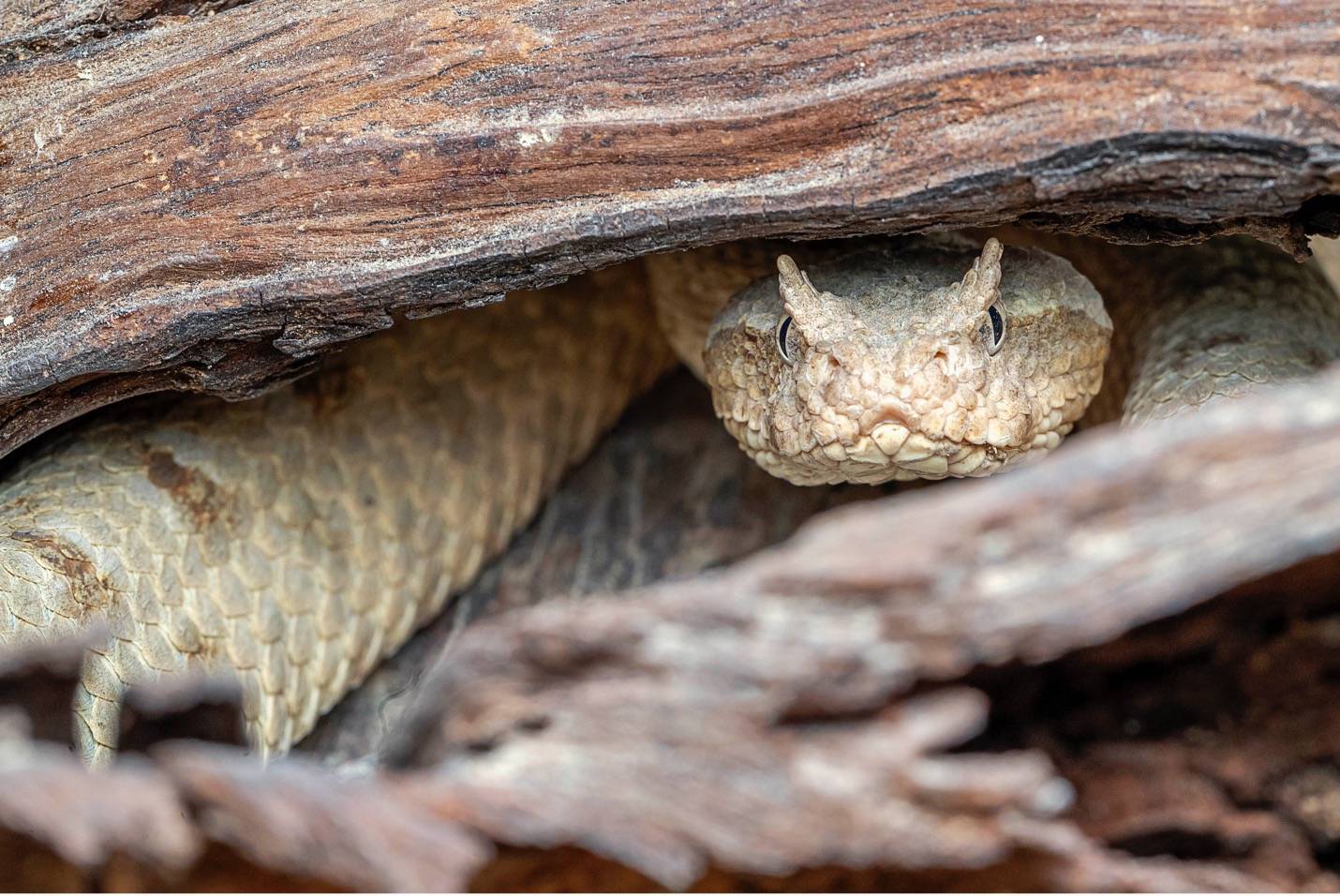 تربض هذه الأفعى في ثنايا الأماكن المموهة جيدا بغية مفاجأة طرائدها من القوارض، بانقضاضها السريع القاتل. تلقب هذه الأفعى بـ«زائفة القرنين»، أما اسمها الشائع فهو «الأفعى المقرنة الفارسية»، وهي نوع من الأفاعي شديدة السمية ويتراوح نطاق انتشارها منطقة الشرق الأوسط وأجزاء كبيرة من آسيا. (تصوير: خالد الحضرمي)