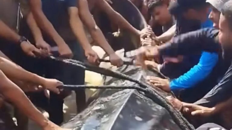 ووفق الفيديو يتحدث شخص ويقول سمكة غريبة تم اصطيادها على شاطئ خان يونس في قطاع غزة طولها 10 أمتار بوزن 2 طن تقريبا.