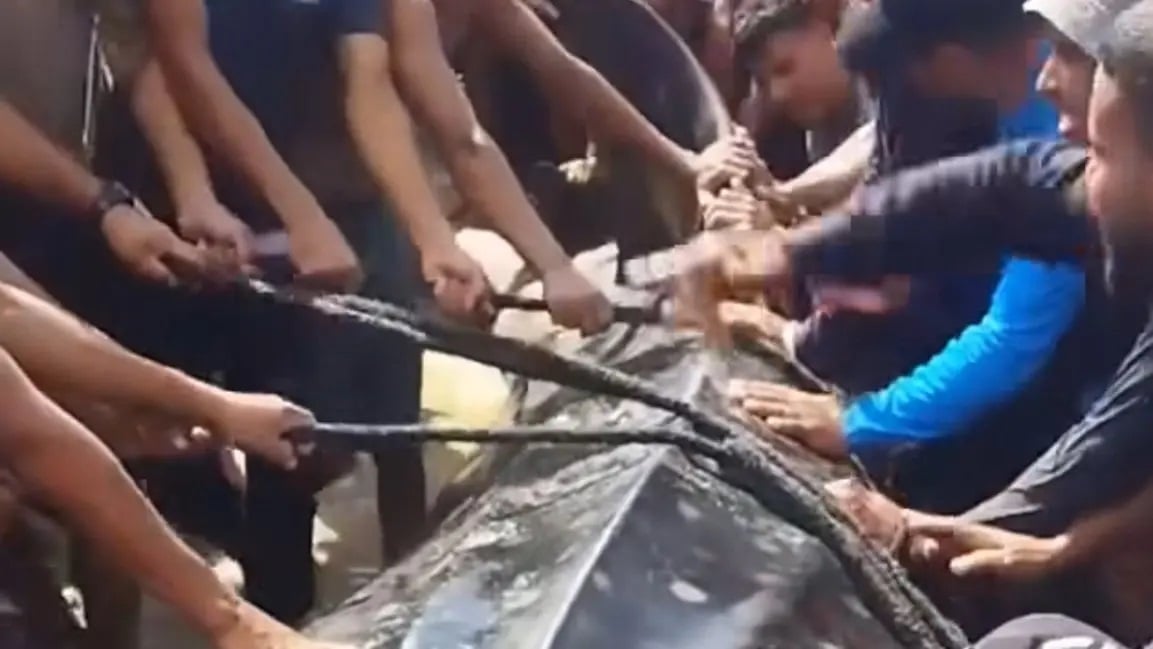 تجمع المئات من سكان غزة حول سمكة ضخمة، بحسب الفيديو الأكثر انتشاراً على مواقع التواصل الاجتماعي اليوم الجمعة.