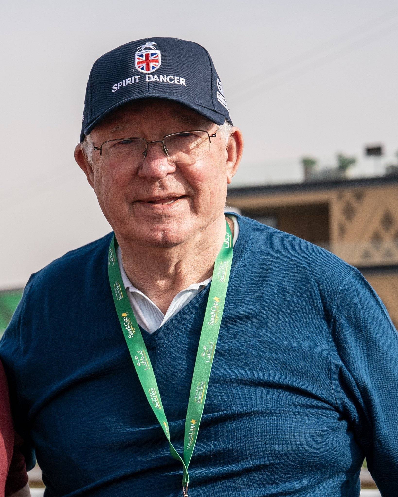 أليكس فيرغسون خلال متابعته استعدادات جواده «سبريت دانسر» للسباق (الشرق الأوسط)
