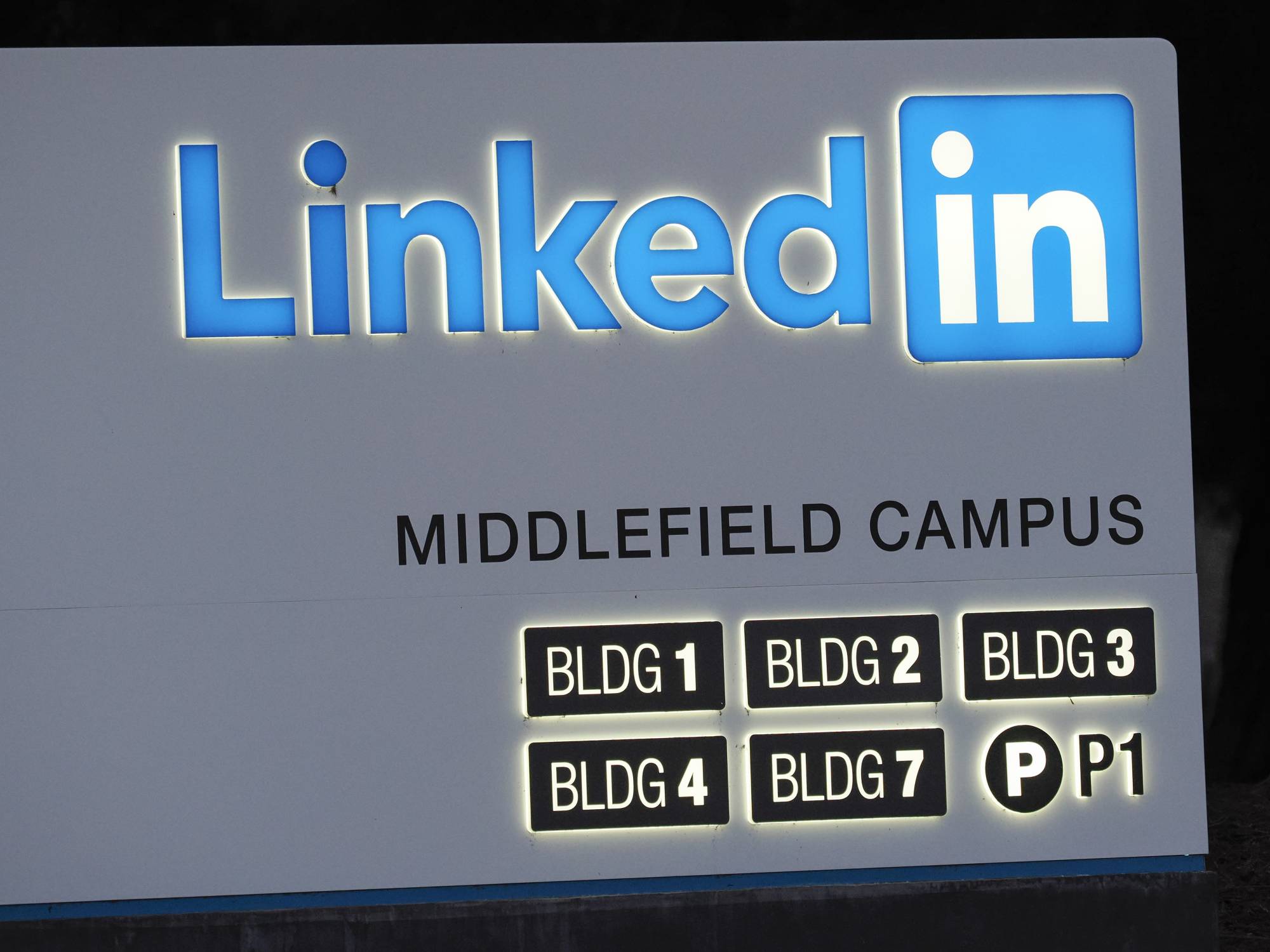 لافتة لـ«لينكد إن» تظهر في المقر الرئيسي للشركة بكاليفورنيا (إ.ب.أ)