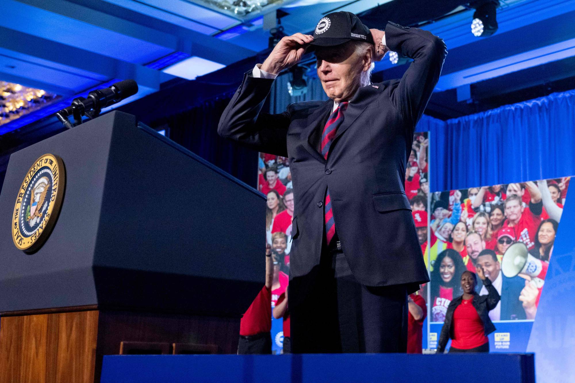 يرتدي بايدن قبعة UAW أثناء حديثه خلال مؤتمر نقابة عمال السيارات المتحدين في فندق ماريوت ماركيز في واشنطن العاصمة في 24 يناير 2024 (أ.ف.ب)