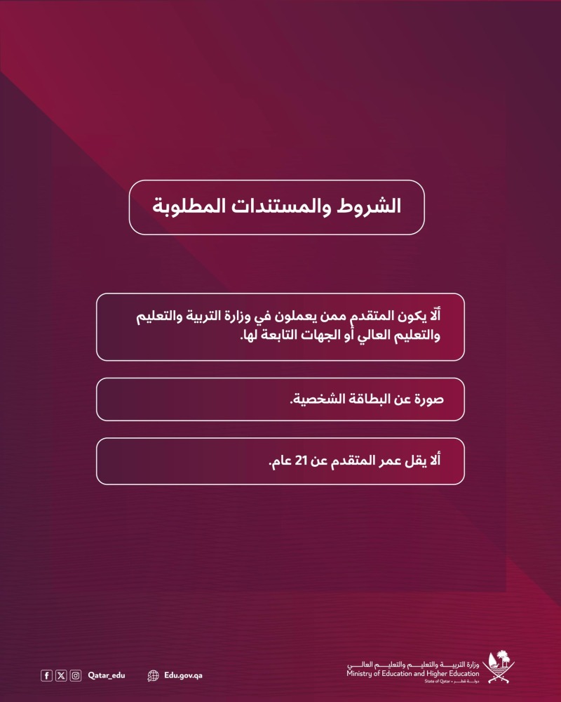 ومن أبرز الشروط الأساسية التي يجب توافرها في المتقدم، بحسب وزارة التربية والتعليم: