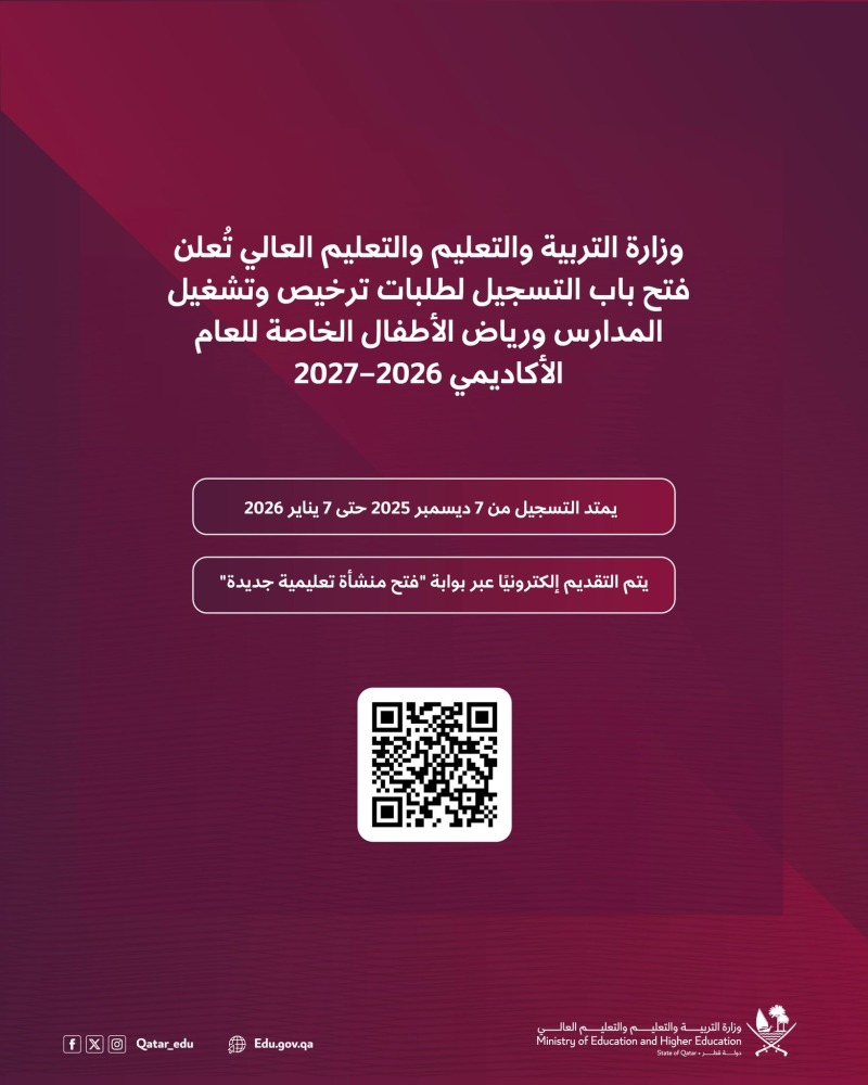 وتكون عملية استقبال الطلبات إلكترونياً على موقع وزارة التربية والتعليم عبر بوابة “فتح منشأة تعليمية جديدة” على الرابط: https://edulicenses.edu.gov.qa، بشروط ومتطلبات خاصة بالمالك والمبنى المدرسي والجانب الأكاديمي، وفقاً لدليل شروط وإجراءات منح تراخيص المدارس الخاصة.