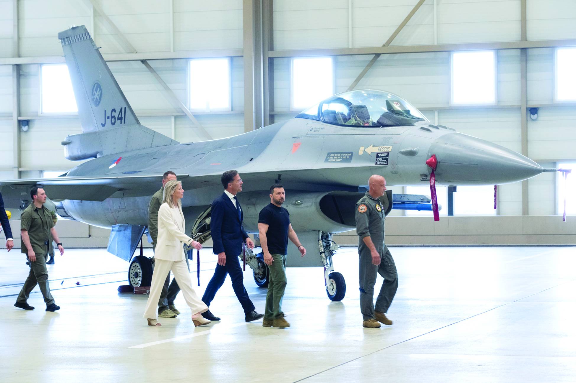 الرئيس الأوكراني فولوديمير زيلينسكي رفقة رئيس الوزراء الهولندي مارك روته في زيارة لقاعدة جوية تحوي طائرات «إف – 16» (أ.ب)