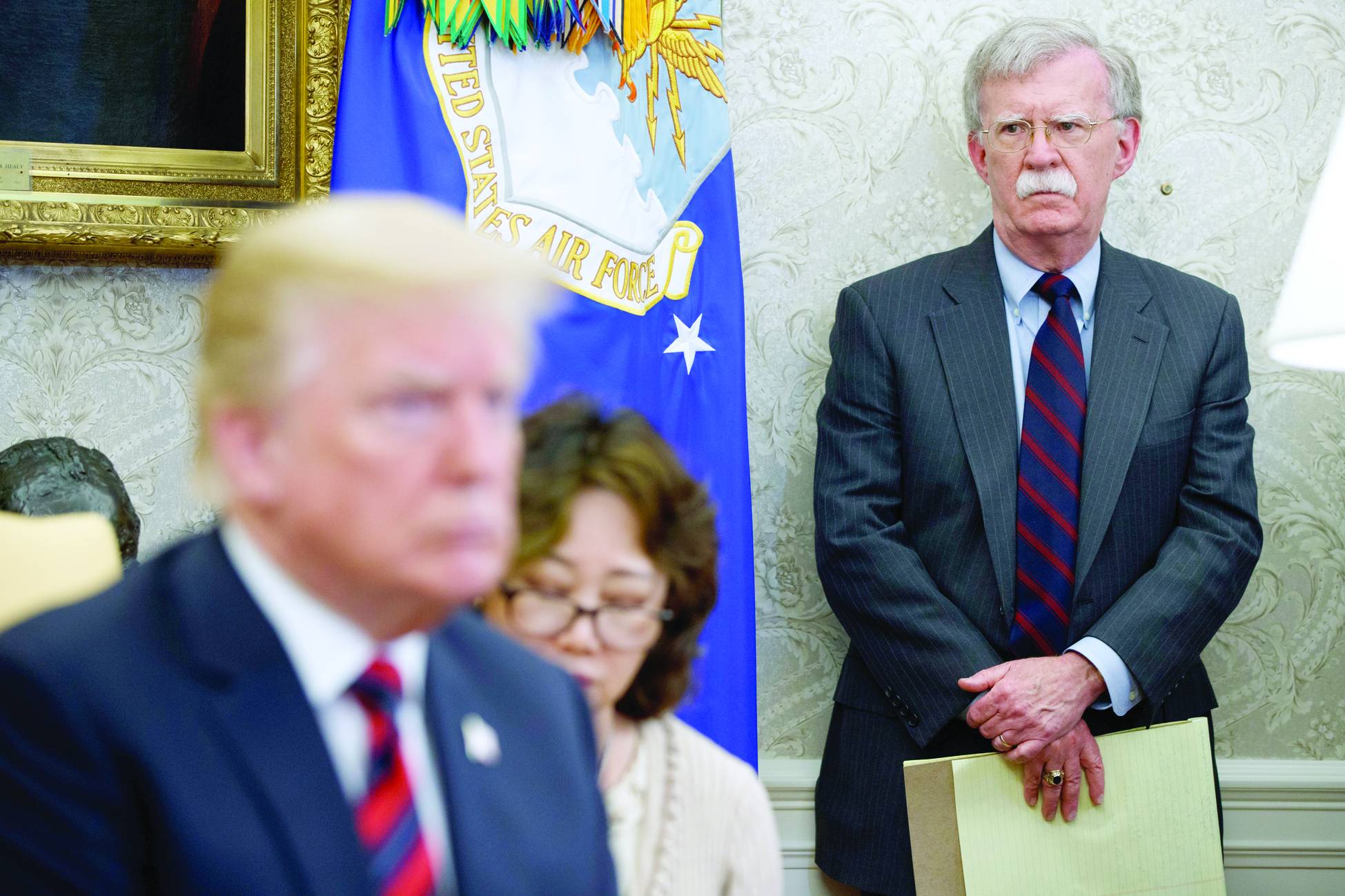 الرئيس الأميركي دونالد ترمب خلال لقاء في البيت الأبيض بحضور مستشار الأمن القومي حينها جون بولتون يوم 22 مايو 2018 (أ.ب)