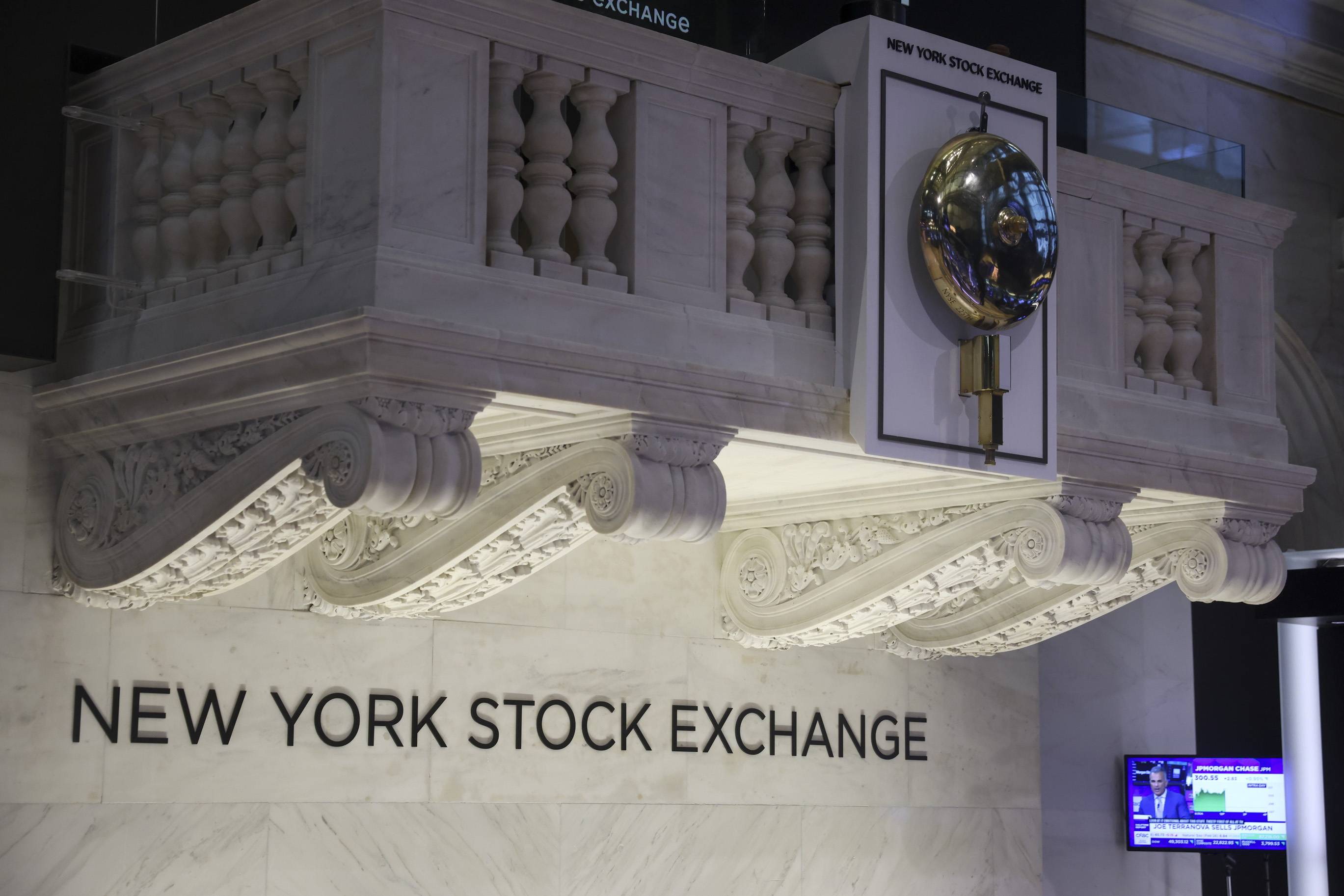 جرس بورصة نيويورك يُرى من قاعة التداول في مدينة نيويورك (إ.ب.أ)
