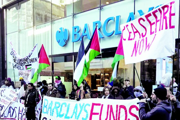 وفي مدينة جلاسجو الاسكتلندية اعتصم عدد من المتضامنين مع فلسطين امام مقر البنك احتجاجا على دور البنك في تسليح تمويل الاحتلال الاسرائيلي والابادة الجماعية، وطالب المعتصمون بوقف التعامل مع البنك، لأنه يقوم بتقديم قروض وتمويل شركات مرتبطة بصناعة السلاح الإسرائيلي، الى جانب دعم مشاريع اقتصادية في مناطق المستوطنات غير الشرعية مما يساهم في استمرار الاحتلال، وذكر المتحدث باسم المعتصمين أن المعتصمين يدعون لمقاطعة هذا البنك وإظهار دعمهم مع فلسطين.