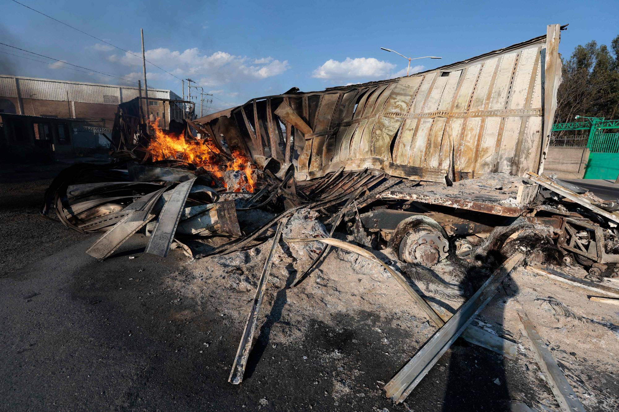 شاحنة محترقة يُعتقد أن جماعات إجرامية منظمة أضرمت فيها النيران على طريق سريعة قرب أكاتلان دي خواريز بولاية خاليسكو المكسيكية الأحد (أ.ف.ب)