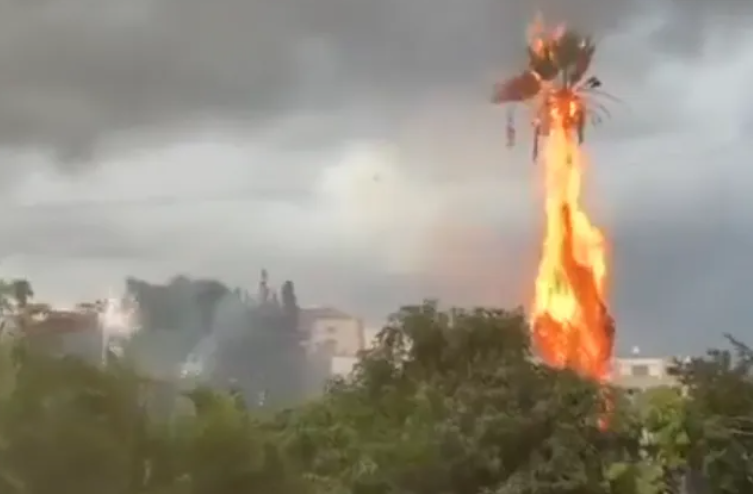 ضربت صاعقة برق قوية مستوطنة روش هاعين في إسرائيل، حيث تسبب الصاعقة في اشتعال النيران بنخلة ضخمة على الفور، بحسب مقطع نشرته هيئة البث الإسرائيلية.