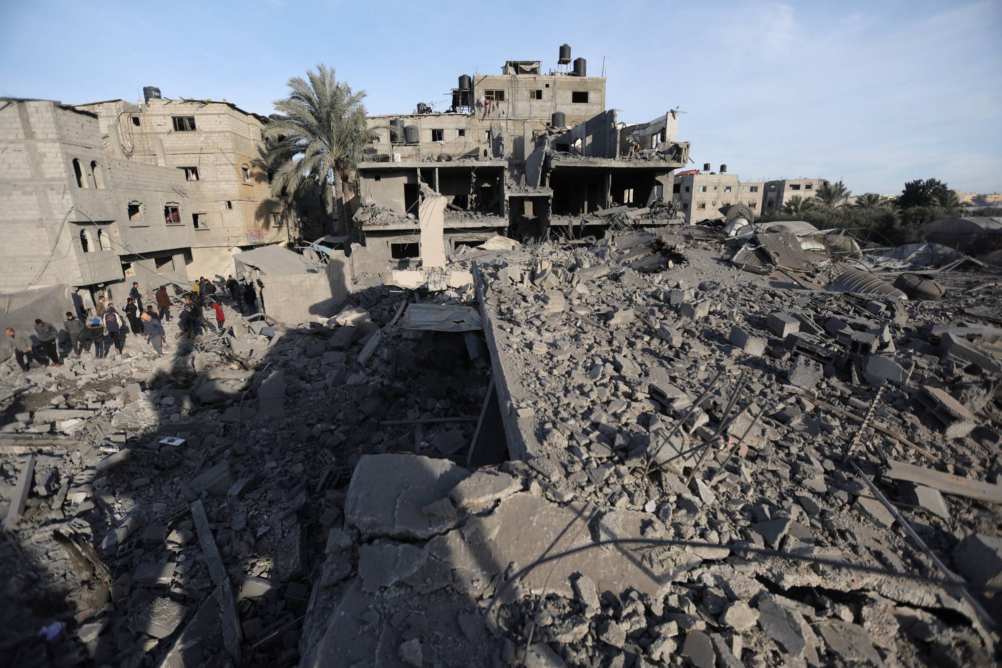 فلسطنيون يتفقدون موقع تعرض لغارات إسرائيلية في رفح (رويترز)