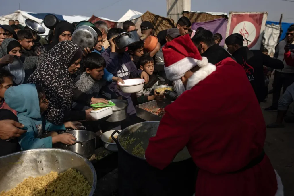 رجل بزي «سانتا كلوز» يشارك في مبادرة خيرية لتوزيع وجبات طعام لنازحين فلسطينيين بخان يونس الجمعة (إ.ب.أ)
