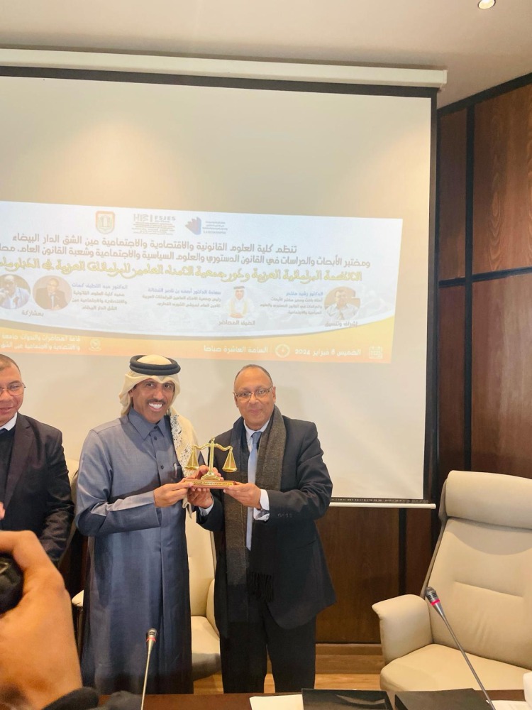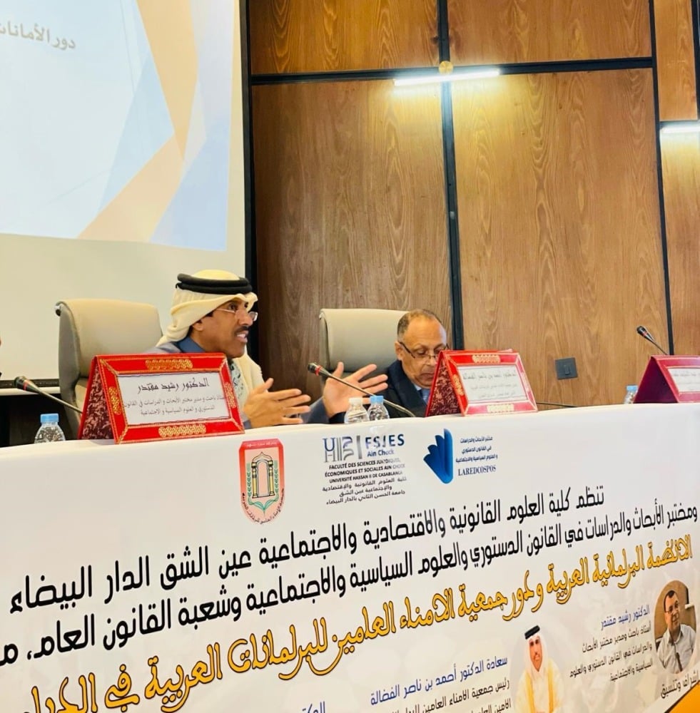 ألقى سعادة الدكتور أحمد بن ناصر الفضالة رئيس جمعية الأمناء العامين للبرلمانات العربية، الأمين العام لمجلس الشورى، محاضرة حول “الأنظمة البرلمانية العربية ودور جمعية الأمناء العامين للبرلمانات العربية في الدبلوماسية البرلمانية”، لطلاب القانون والباحثين في الدراسات العليا في مجال القانون بجامعة الحسن الثاني، بالمملكة المغربية الشقيقة.