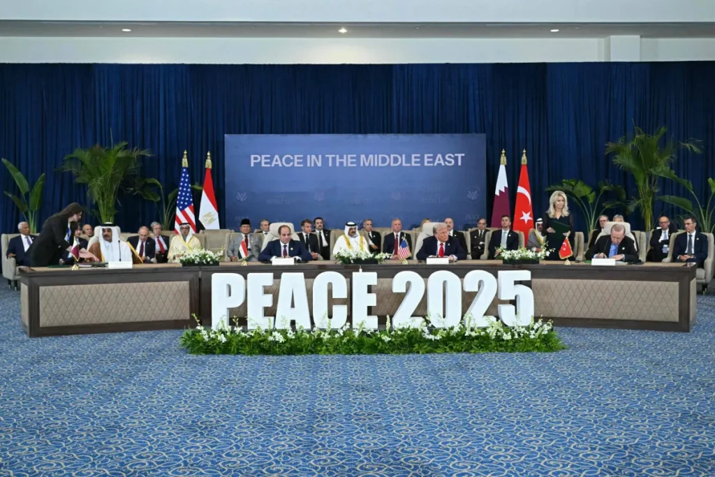 وشارك ترمب في رئاسة «قمة شرم الشيخ للسلام» إلى جانب الرئيس المصري عبد الفتاح السيسي، بحضور 31 من قادة وممثلي دول ومنظمات دولية، فيما أوفد الأمير محمد بن سلمان بن عبد العزيز، ولي العهد السعودي رئيس مجلس الوزراء، الأمير فيصل بن فرحان بن عبد الله، وزير الخارجية، للمشاركة نيابة عنه في القمة. ولم يحضر رئيس الوزراء الإسرائيلي بنيامين نتنياهو ولا ممثلون لـ«حماس» القمة، في حين شارك فيها الرئيس الفلسطيني محمود عباس، الذي صافح الرئيس الأميركي.