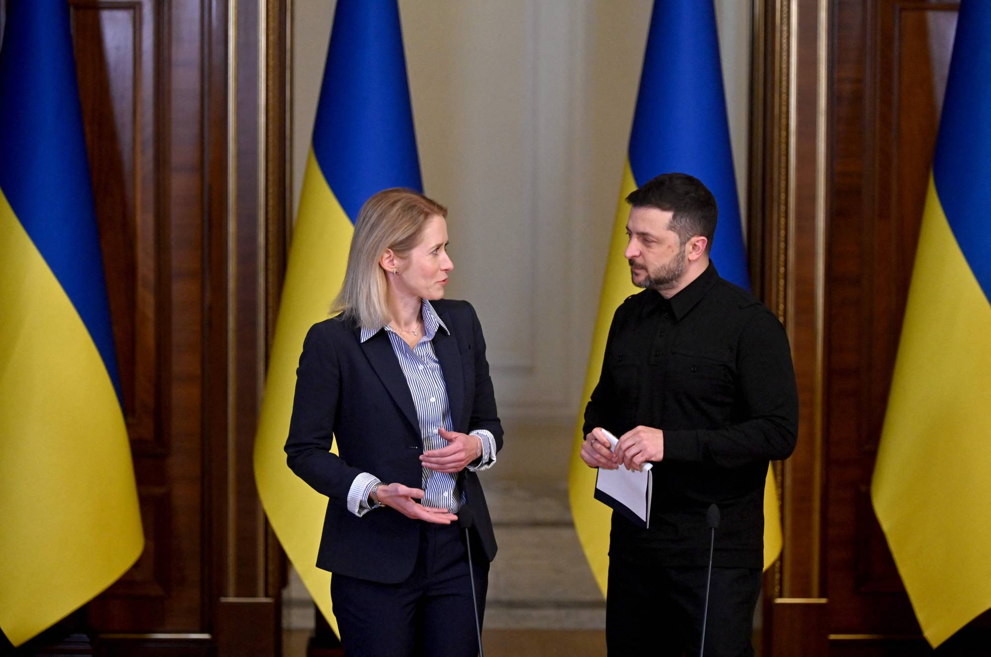 الرئيس الأوكراني فولوديمير زيلينسكي والممثلة العليا للاتحاد الأوروبي للشؤون الخارجية والسياسة الأمنية كايا كالاس خلال مؤتمر صحافي مشترك بعد محادثات في كييف أوكرانيا 13 أكتوبر 2025 (أ.ف.ب)