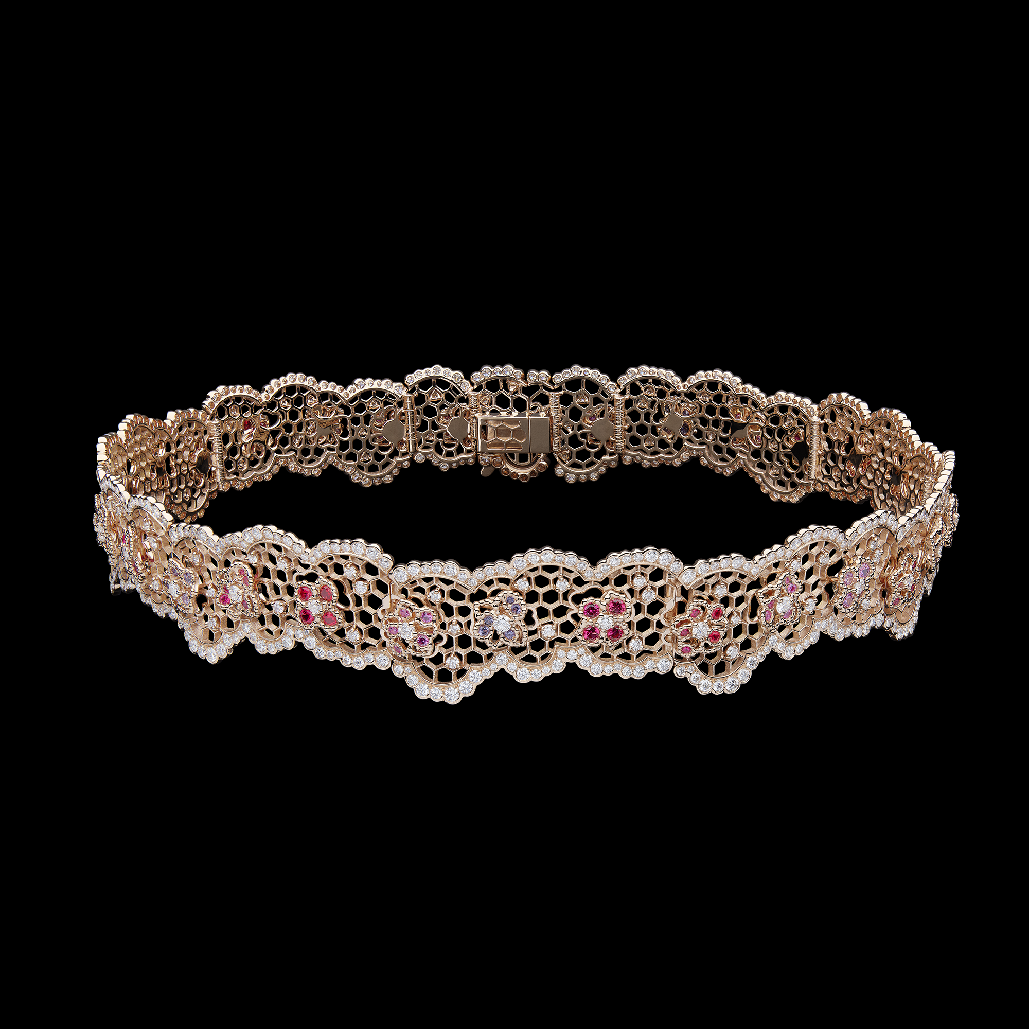 أما السمة الرئيسية للقلادة، فماسة بوزن قيراطين تتوسط دوائر من الكريستال الصخري وماسات مستديرة. استغرق صنع هذه القلادة 1070 ساعة، ويقدر ثمنها بـ1.6 مليون يورو؛ أي ما يعادل 1.7 مليون دولار.