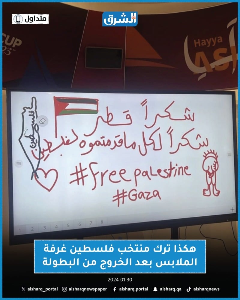 ترك لاعبو المنتخب الفلسطيني، رسالة في غرفة الملابس، لدولة قطر وجمهور العنابي، عقب الخسارة من المنتخب القطري ووداع بطولة كأس آسيا قطر 2023.