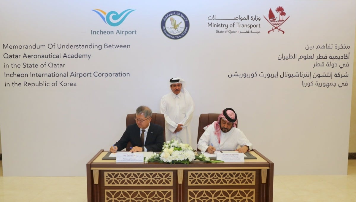 وقعت أكاديمية قطر لعلوم الطيران، اليوم، مذكرة تفاهم لتعزيز التعاون في مجال الطيران المدني مع أكاديمية إنتشون للطيران في كوريا الجنوبية.