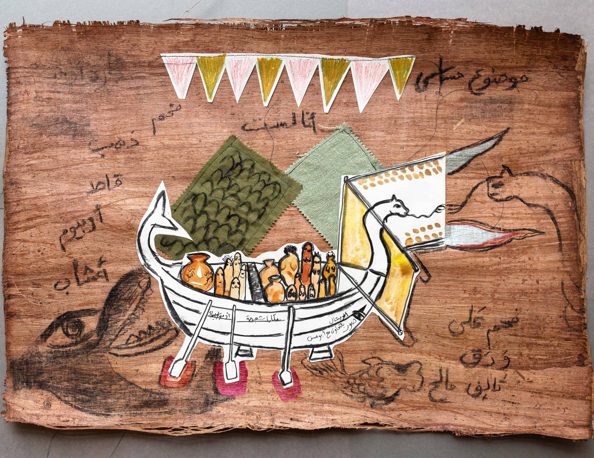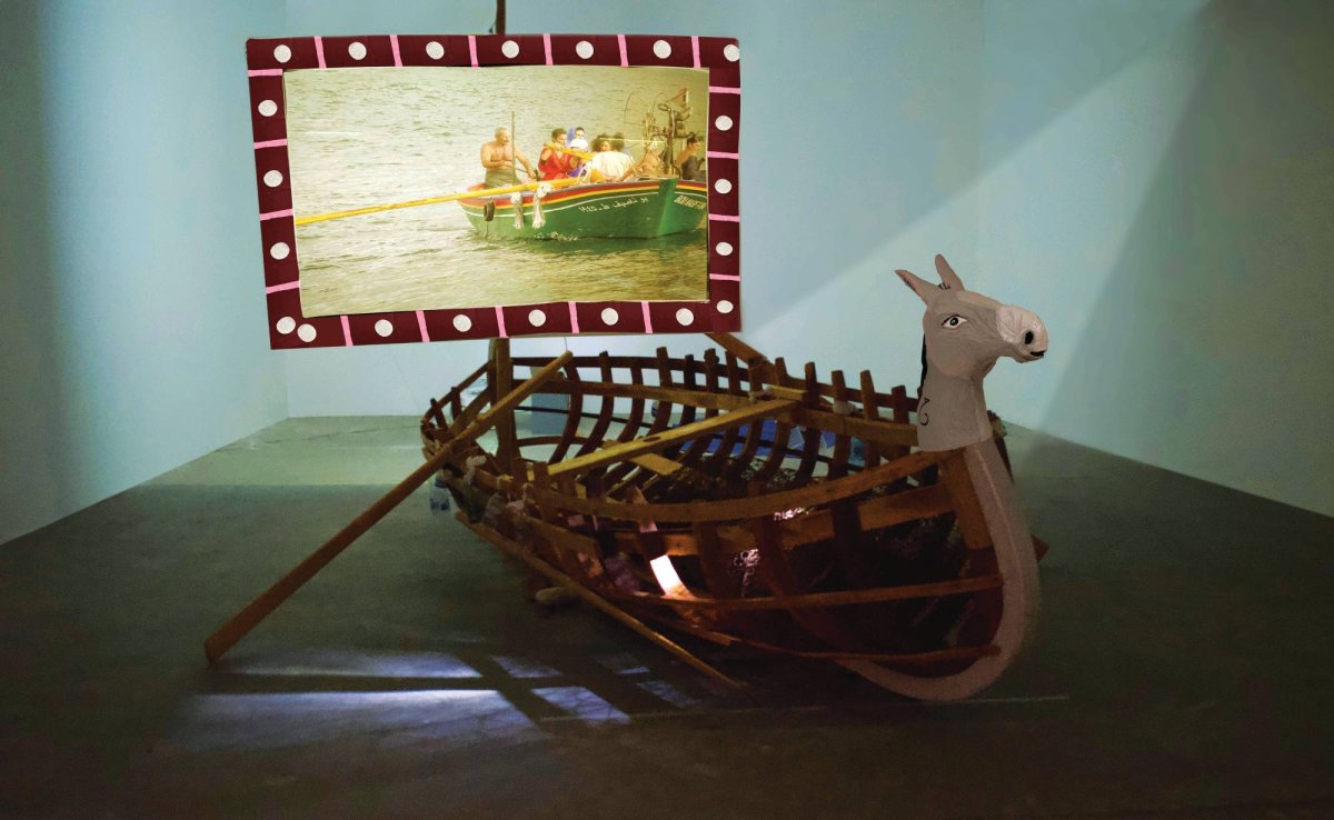 يتمحور تجهيز «رقصة من حكايتها» حول قاربٍ يدعونا إلى رحلة رمزية للانعتاق والمساواة بين الجنسين. غير أن هيكل القارب غير المكتمل يشيرُ إلى أن هذه الرحلة لم تكتمل تماماً. يستقرُّ تجهيز منيرة الصُّلح في مسارٍ تنظمه علاقات القوى. وفي وسط المعرض، نرى القارب في منتصف الطريق بين الأعمال التصويرية والرسومات التي تدعو إلى التشكيك في المعايير الجنسانية وإلى النضال من أجل المساواة من جهة، ومن جهةٍ أخرى الأقنعة التي تجسّدُ القوى المحافظة في المجتمع. بالإضافة إلى ذلك، تأخذُ الأجسام التي نراها في مساحة المعرض أدواراً في الفيلم (12 دقيقة) المعروض على شراع القارب.