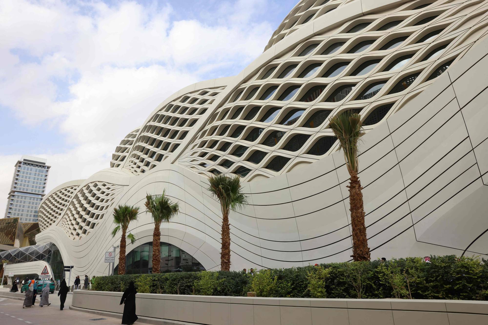 أشخاص يسيرون خارج محطة قطار الرياض في مركز الملك عبد الله المالي (رويترز)