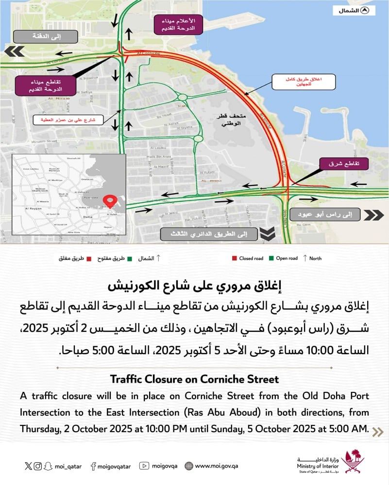 من تقاطع ميناء الدوحة القديم إلى تقاطع شرق (رأس أبوعبود) في الاتجاهين، وذلك من الخميس 2 أكتوبر 2025، الساعة 10:00 مساءً وحتى الأحد 5 أكتوبر 2025، الساعة 5:00 صباحاً.