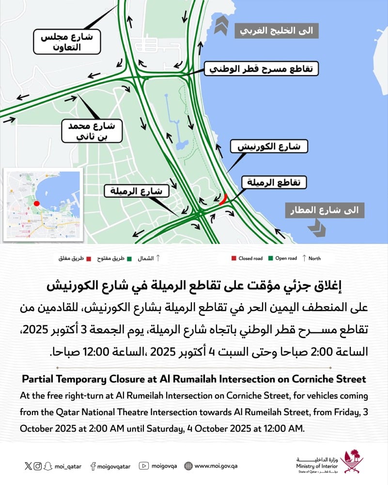 على المنعطف اليمين الحر في تقاطع الرميلة بشارع الكورنيش، للقادمين من تقاطع مسرح قطر الوطني باتجاه شارع الرميلة، يوم الجمعة 3 أكتوبر 2025، الساعة 2:00 صباحاً وحتى السبت 4 أكتوبر 2025، الساعة 12:00 صباحاً.