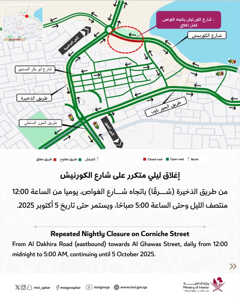 لفتت وزارة الداخلية عناية مستخدمي الطريق إلى وجود بعض الإغلاقات المرورية المؤقتة على طريق الكورنيش، وبعض الطرق المؤدية إليه، والتي تستمر حتى تاريخ 5 أكتوبر 2025، الساعة 5 صباحًا.