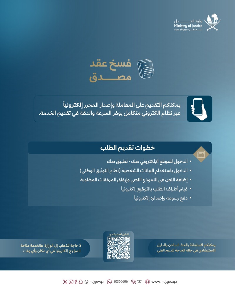 نبّهت وزارة العدل إلى إمكانية إنجاز معاملة فسخ عقد مصدق إلكترونياً عبر بوابة وتطبيق صك، ضمن حزمة معاملات التصديق على التوقيعات بإدارة التوثيق.