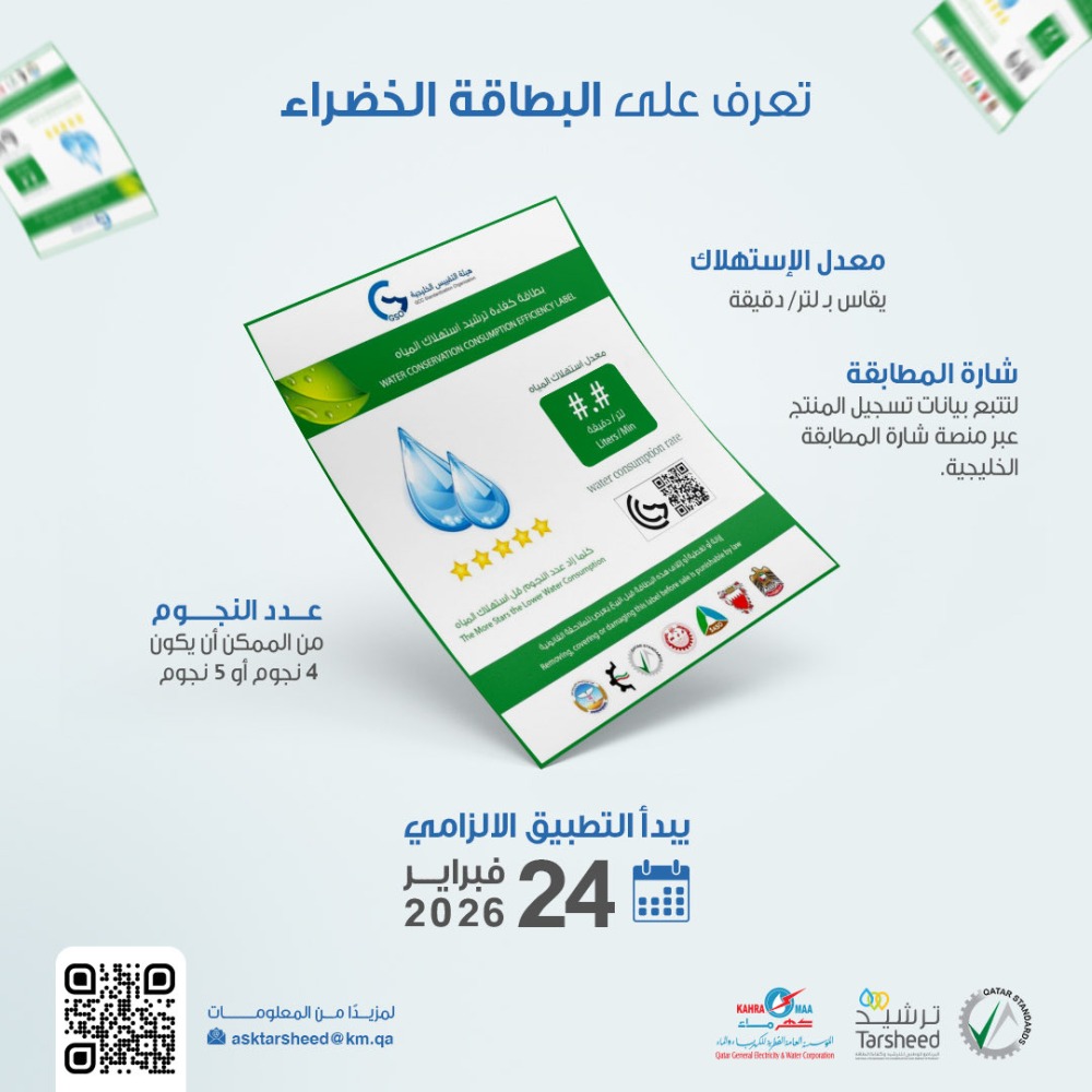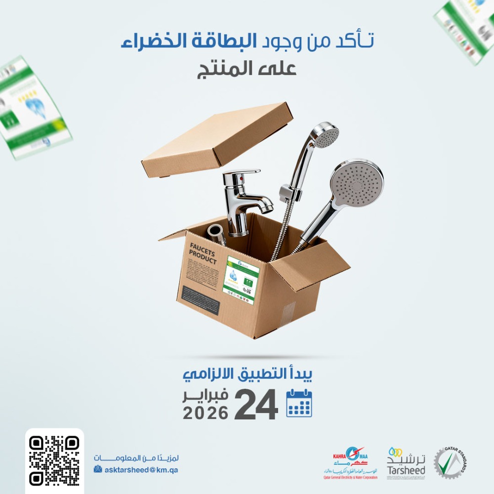 وفي 13 ديسمبر الماضي أعلنت المؤسسة العامة القطرية للكهرباء والماء “كهرماء”، بالتعاون مع الهيئة العامة القطرية للمواصفات والتقييس، عن تطبيق اللائحة الفنية الخليجية لأدوات ترشيد استهلاك المياه في قطر، اعتباراً من 24 فبراير 2026، بما يضمن تحقيق أهداف الاستدامة الوطنية والارتقاء بكفاءة استخدام المياه في دولة قطر وفق المنظومة الخليجية الموحدة.