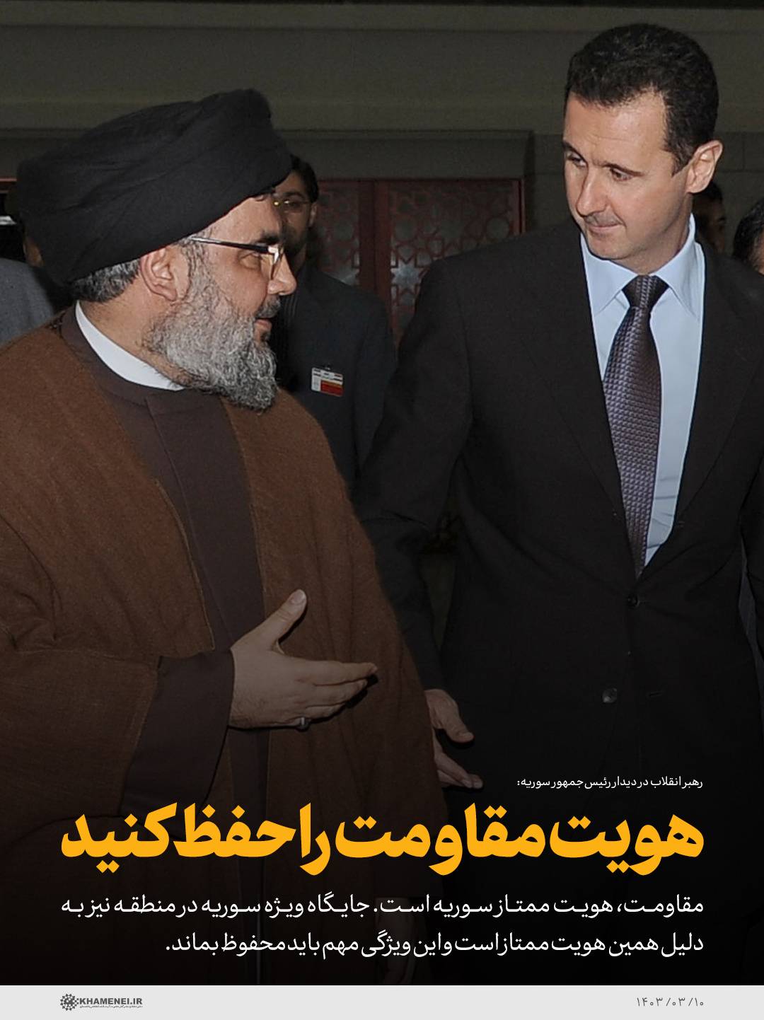 في ذلك اللقاء، قدم خامنئي خلاصة «عقيدته» السورية على ضوء المستجدات في ساحات «محور المقاومة». فـسوريا، في نظره، ليست دولة عادية، بل صاحبة «مكانة خاصة»؛ لأن هويتها – كما رأى – تتشكل من دورها في هذا المحور.
