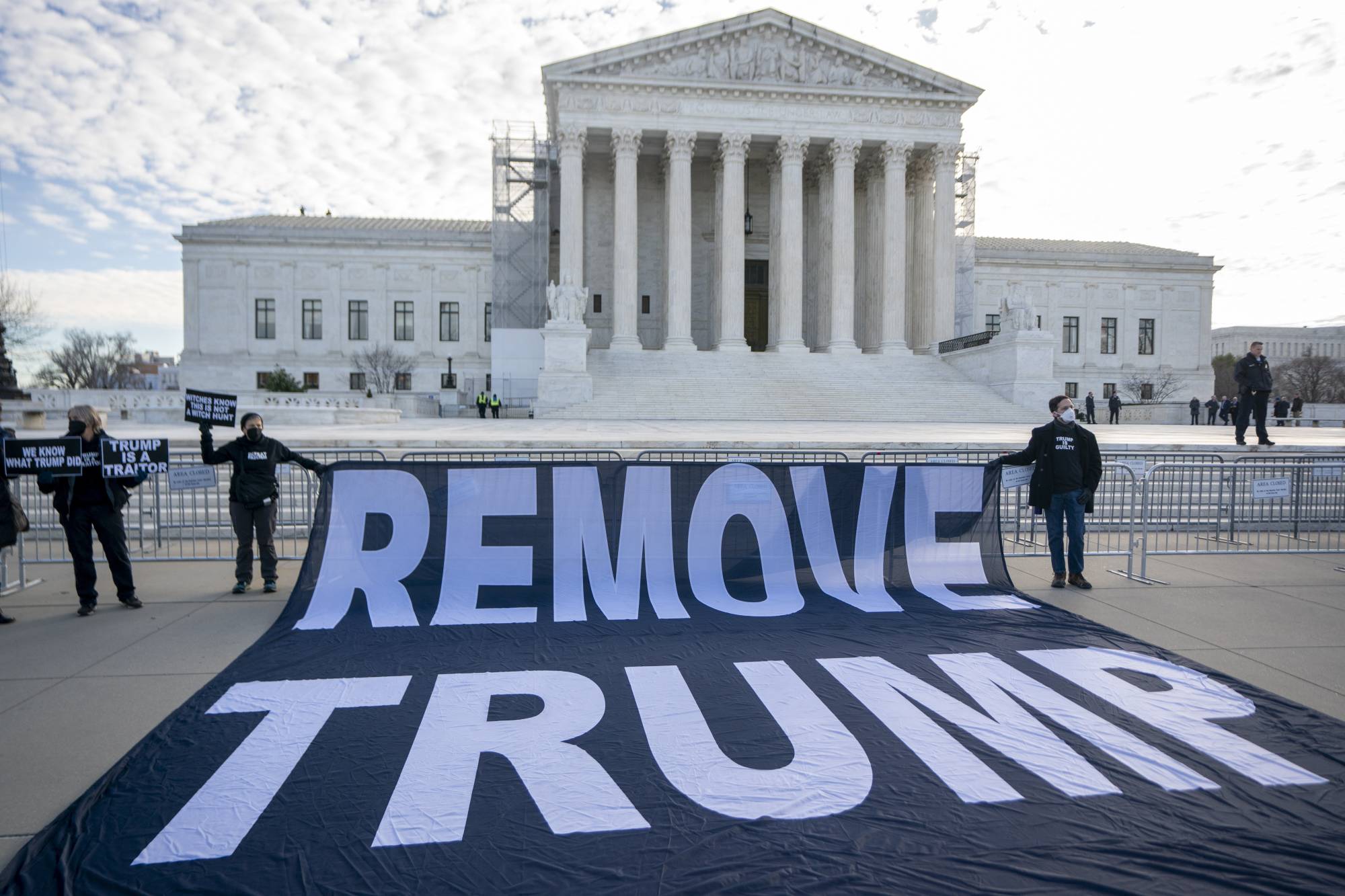 متظاهرون يطالبون بمنع ترمب من خوض الانتخابات خارج المحكمة العليا (إ.ب.أ)